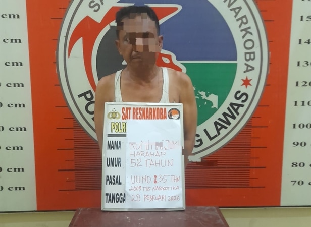 Padang Lawas – Tim Opsnal Satuan Reserse Narkoba Kepolisian Resor Padang Lawas (Satresnarkoba Polres Palas) kembali menangkap seorang pengedar narkotika jenis sabu Berinisial MRH, (52), warga desa Pancaukan, Kecamatan Barumun, Kabupaten Palas, di salah satu rumah yang berlokasi di Wek I, Pasar Sibuhuan, Kecamatan Barumun, Kabupaten Palas. MRH yang ditangkap ini, Sabtu (28/2/2026) sekira pukul 03.30 WIB ini diinformasikan sering konsumsi dan transaksi sabu dalam rumah.
